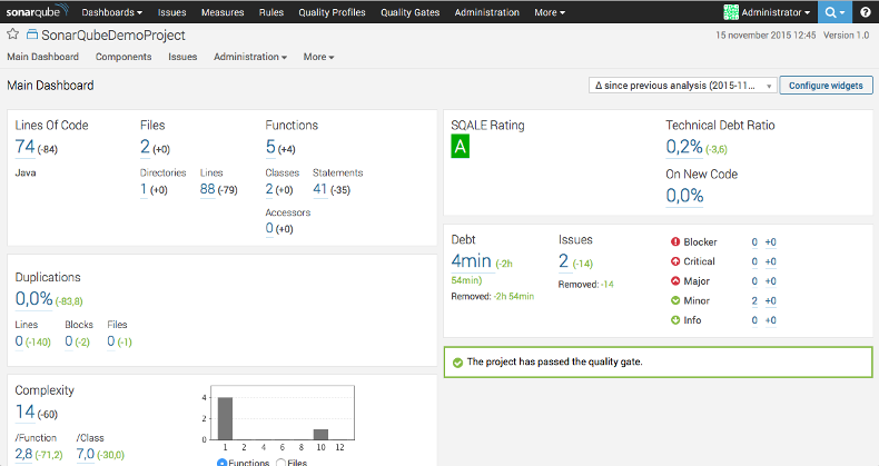 Genom att kontinuerligt analysera koden så kan SonarQube visa hur kvaliteten i projektet utvecklats över tid. Det går att bygga upp egna översiktsvyer med de värden man är intresserad av. Dessa översiktsvyer är ett bra sätt att visualisera den tekniska skulden i ett system. Det är enkelt att från översikten komma ned på detaljnivå och tillbaka.